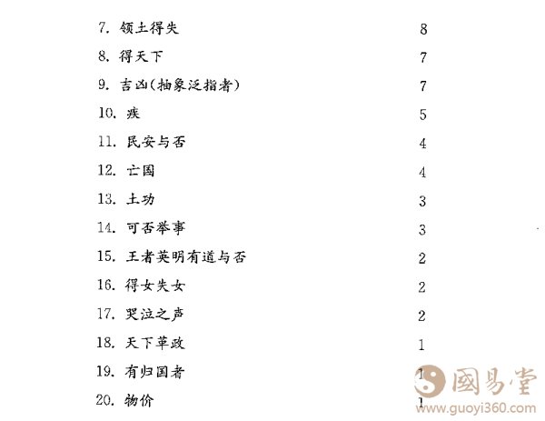 在人的主体性张扬的先秦岁月里,虽然产生了不同的对于命的观念,但是并没有出现系统的关于个人命运的研究。《历史上的星占学》一书,对西汉初年司马迁所作的《史记●天官书》中占辞作了下面的分类统计: