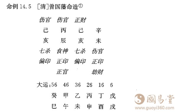 徐乐吾对此作了解释:“五宫所藏为己辛癸三神。癸水8日元更见己、辛同透,此为日主喜用同宫。生于十二月,非丙丁不可。有己土同透,故丁火可用。但此为特殊格局,非可以五行常理论。”他接着引用了以下命例来予以解释: